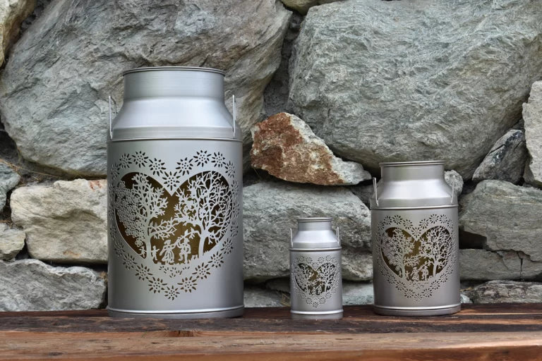 Diese Kollektion unserer Milchkannen-Laternen ist mit dem Scherenschnitt- Klassiker von Esther Gerber in Herzform gestaltet.