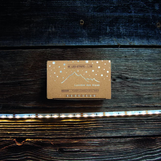 Die Kollektion umfasst LED-Lichterketten in verschiedenen Längen und unterschiedlicher Stromzufuhr (Kabel oder Batterie). Alle Produkte sind mit warmem Licht ausgestattet. Die Verpackung mit silbrig geprägten Schneeflocken und Sternen auf Kraftkarton runden diese Kollektion liebevoll ab.